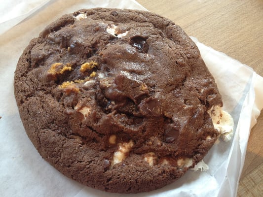 I had a really hard time making up my mind which flavor I wanted. I planned on getting two: chocolate chip and sugar, but not only did they have cookies, but they also had ice cream! So, I decided to get one cookie and cookie dough ice cream because I love cookie dough ice cream! But, then I saw the glorious S'Mores deluxe cookie, a chocolate cookie infused with marshmallows and graham cracker bits.
